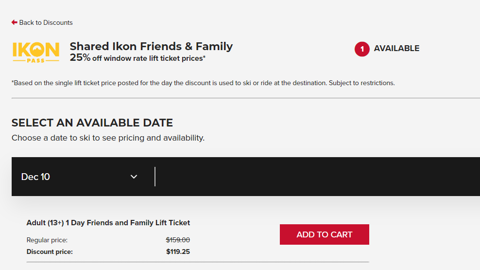 - Lift ticket options will appear with your Friends and Family discount applied and then you can add the ticket you want to your cart