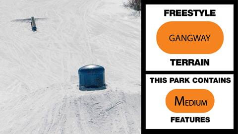 Gangway, located under the Prospector lift, is a medium park with intermediate rails, boxes, and jibs. When you are ready to show off your style to the folks on the lift above, this is the spot to let ‘er rip. One can access this park by staying right at the bottom of Butches Breezeway, after shredding the bumps on Engledive, or after a Skills Course lap.