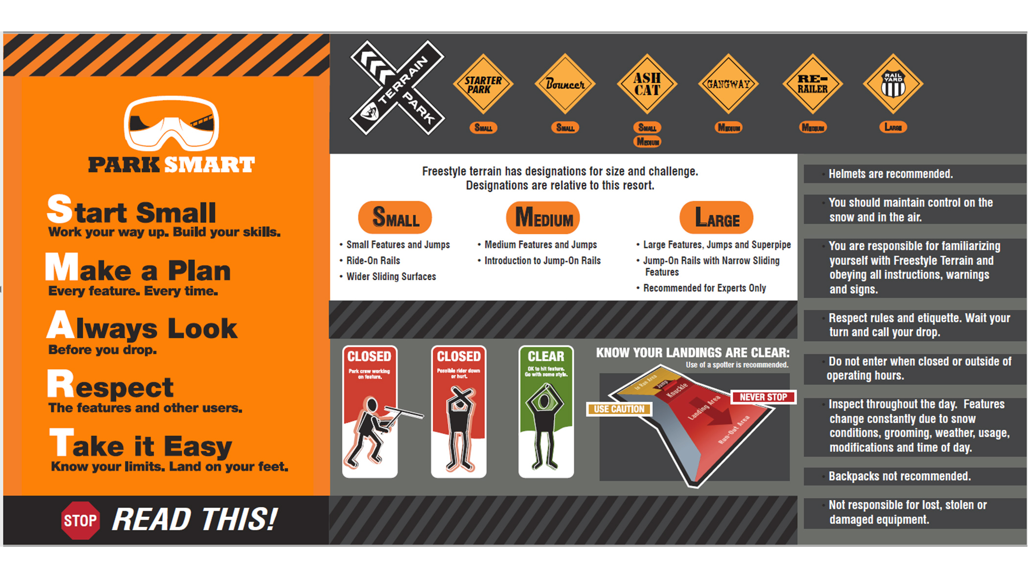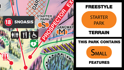 Starter Park is exactly that, a small park to start your journey into the terrain park world. Starter Park has ride-on features that give you the chance to experience sliding on plastic/metal surfaces. During the season, the park crew may change up the park and add a small jump for you to practice your approach and take-off techniques. Located below Snoasis, it is a great opportunity to let your friends and family finish lunch while you sneak in a few attempts at honing your style.