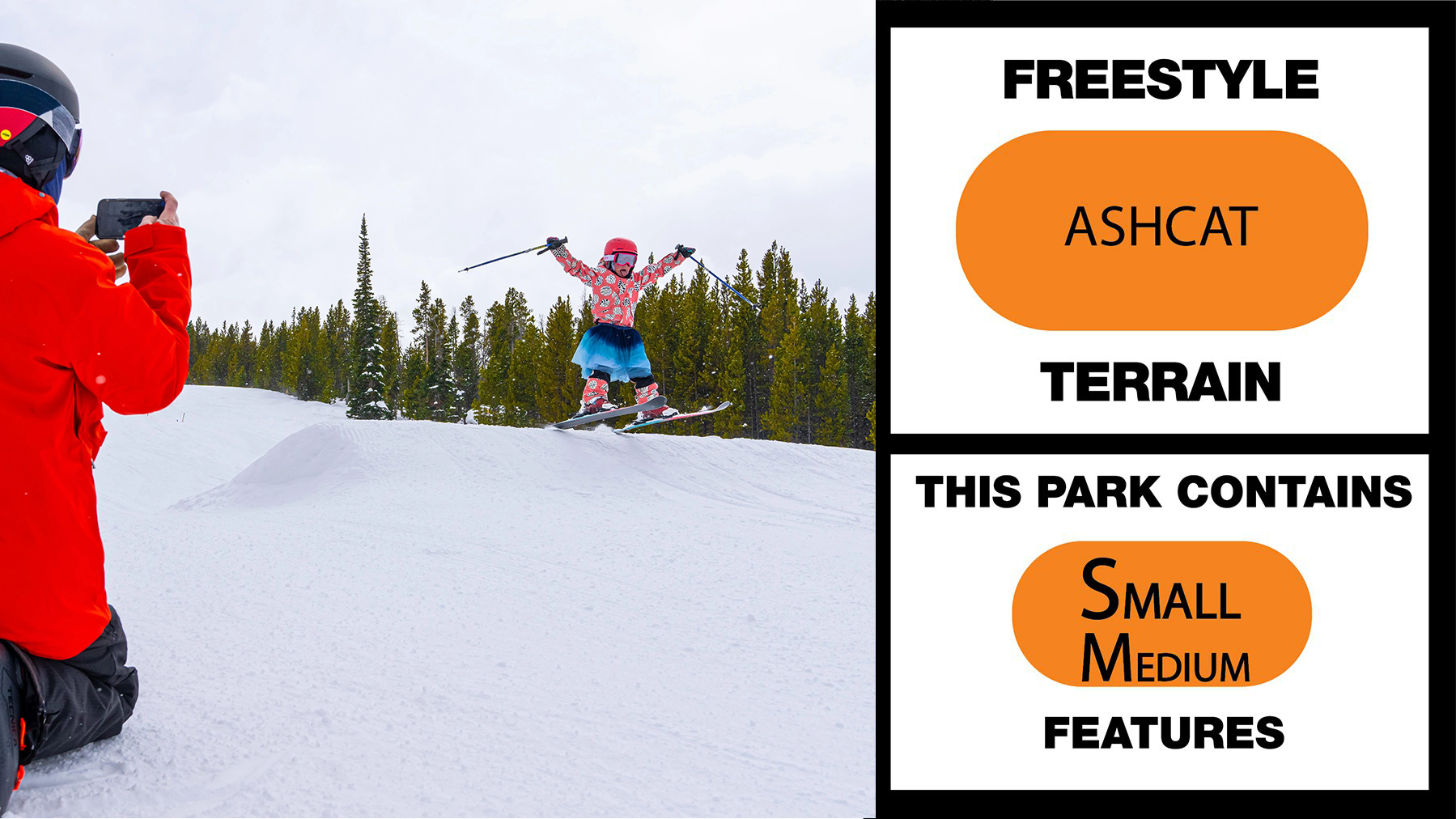 Ash Cat, located on Jack Kendrick trail, is a small and medium feature park. Ash Cat features a variety of rails, boxes and jibs that range from ride-on to intermediate sliding surfaces. This park is also the place to begin progressing in your jump techniques with small and medium jumps. One can access Ash Cat by taking the Prospector lift and heading down Jack Kendrick. Get your style dialed and flow progressing here.